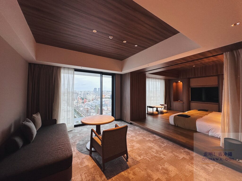 最棒的是,因為搭配兩大面落地窗玻璃,因此房間內的採光非常好,搭配窗外就是那霸市景及單軌列車軌道,望出去實在舒壓。
