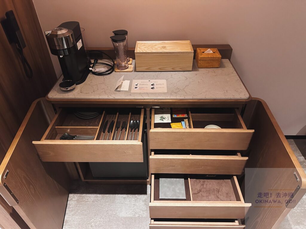 客廳空間以一張沙發床、小沙發椅及茶几為主,旁邊的小櫃子則有雀巢膠囊咖啡機、藝術家手作陶瓷杯、Marshall藍芽音響及一些基本餐具。